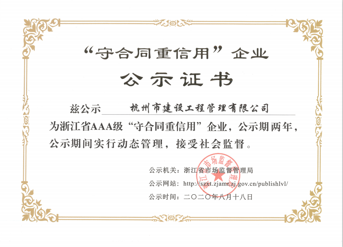 开云手机入口官网建设工程管理有限公司荣获2020年浙江省AAA级“守合同重信用”公示证书,不仅证实了杭建“不信不立,不诚不行”一诺千金的企业行为,而且证明了杭建人在砥砺前行的道路上工作井然有序与有条不紊,我们将坚持以严谨的工作态度、实事求是、科学公正的立场,致力于招标代理和造价咨询事业。公司全体员工衷心感谢广大新老客户对公司发展的支持和帮助!